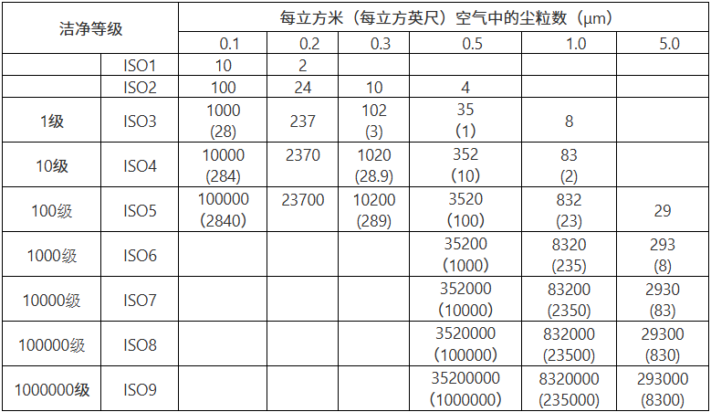 洁净室洁净度等级表