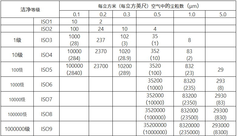 洁净室洁净度等级表