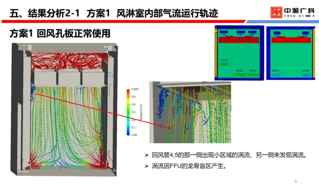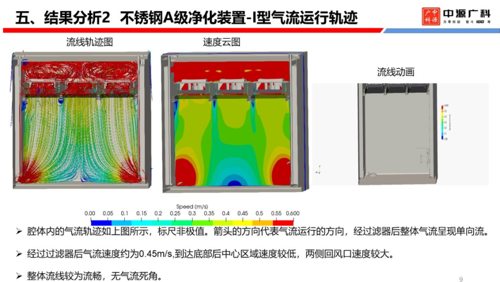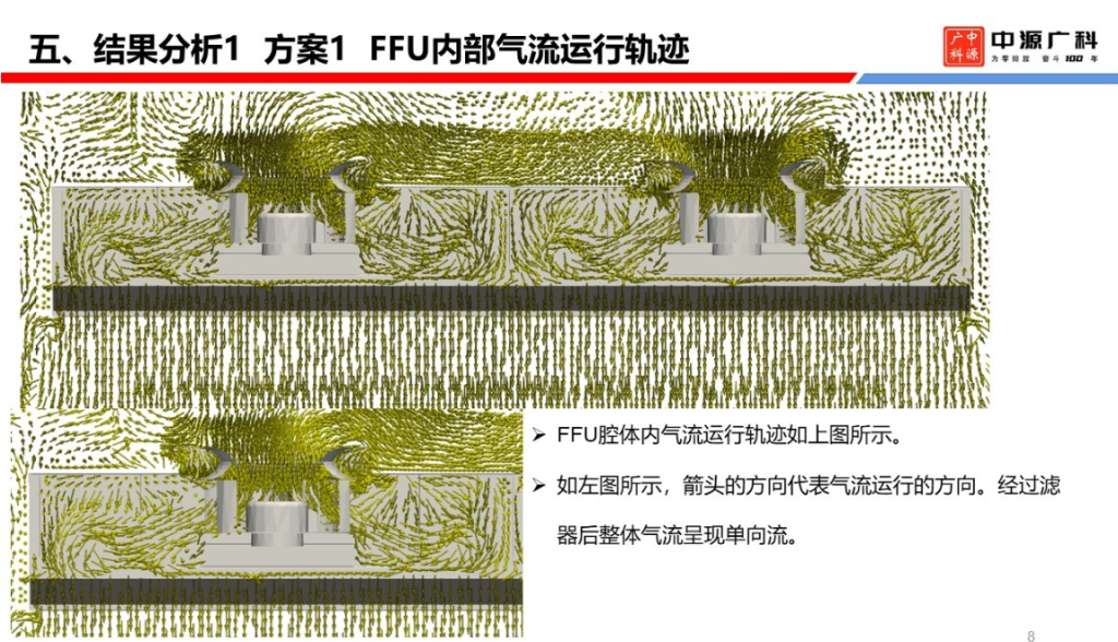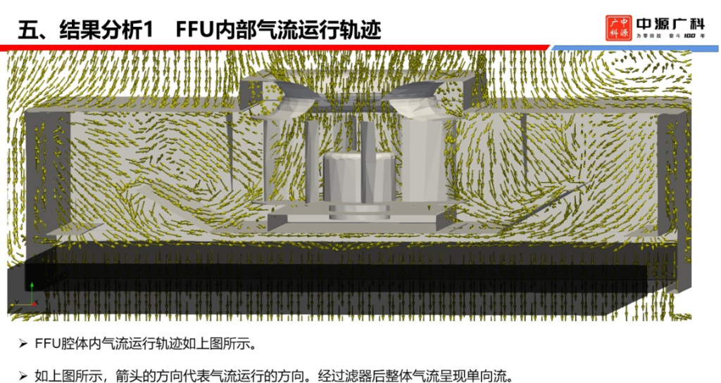 根据项目要求,我公司委托第三方对所供的非标产品,进行了CFD 的气流模拟。从模拟的结果看,FFU 的均匀性比较好,能够满足 0.45 ±15% m/s 的结果,符合了恩威特公司的设计要求。